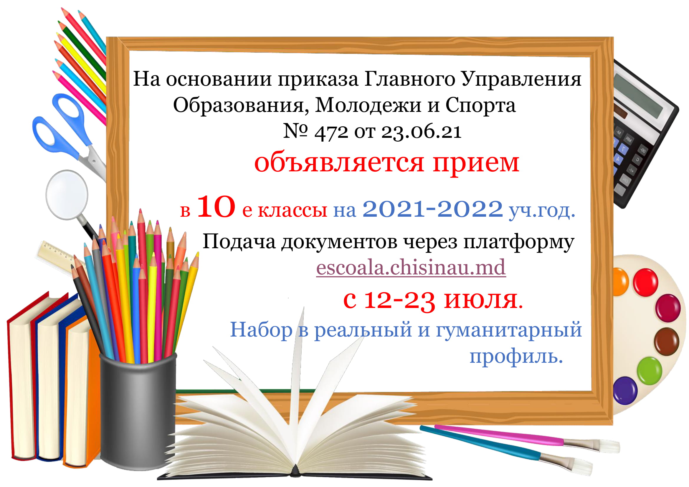 На основании приказа Главного Управления Образования, Молодежи и Спорта № 472 от 23.06.21 объявляется прием в 10 е классы на 2021-2022 уч.год. Подача документов через платформу escoala.chisinau.md с 12-23 июля. Набор в реальный и гуманитарный профиль.